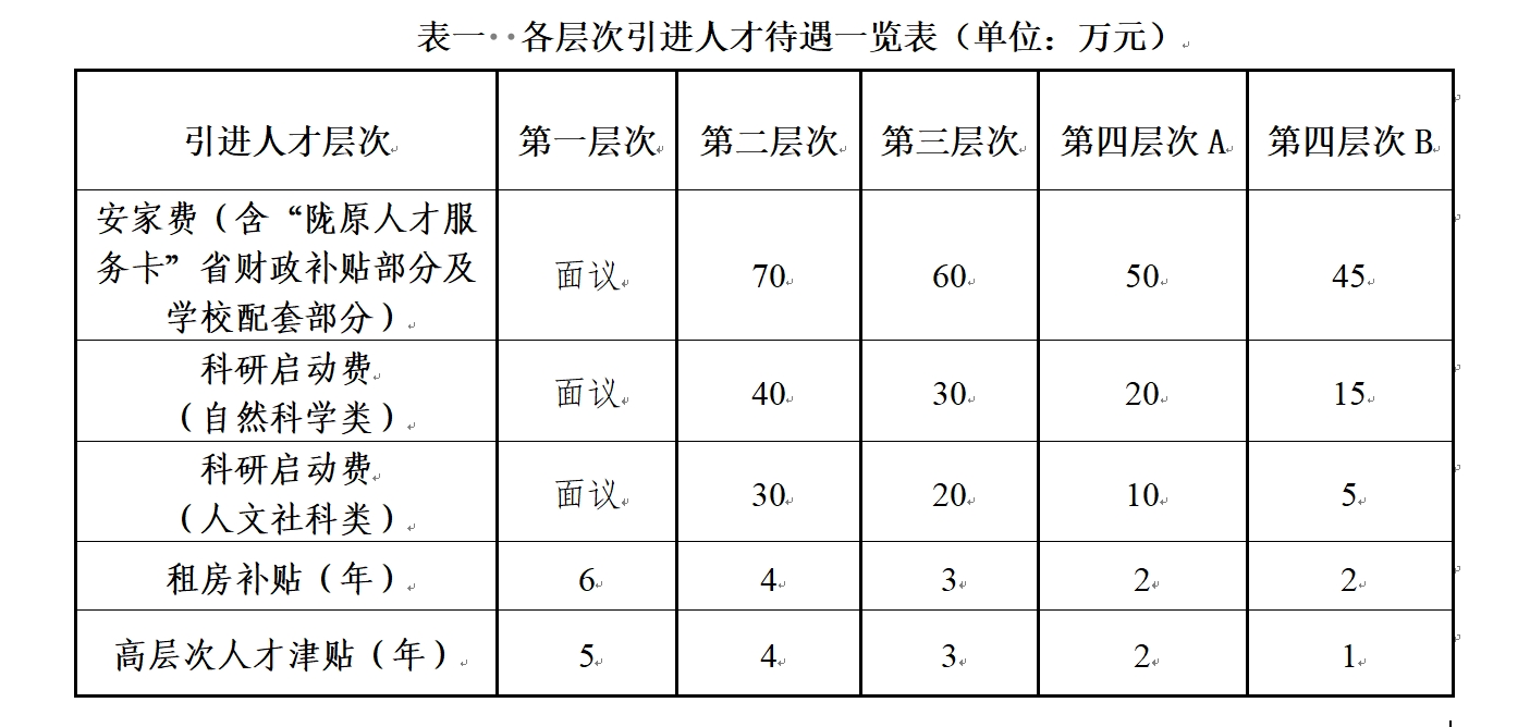 (一)根据《兰州工业学院高层次人才引进与管理办法(试行)》(兰工院〔2022〕95号),全职引进高层次人才分为四个层次,具体待遇见表一: