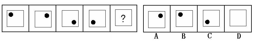 (答案:B。黑点在正方形中顺时针移动。在第5个图形中,应该正好移动到左上角。)