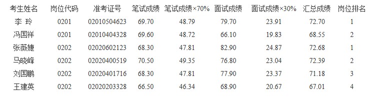 根据事业单位公开招聘有关规定,现将11月15日参加我局面试的6位考生的综合成绩公布如下: