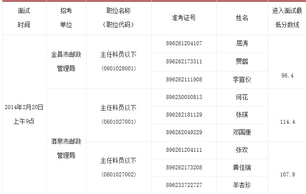 甘肃省邮政管理局2014年度考试录用公务员面试公告